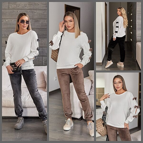 Фото 2-5 код 7124Кофта вільного силуету забезпечує комфорт і не сковує рухів. Неглибока кругла горловина виглядає стримано і гармонійно, а довгі рукави на манжетах доповнені розрізами з декоративними бантиками, що додає особливого шарму. Штани мають зручну посадку, пояс на м´якій резинці, місткі кишені та манжети внизу штанин для гарного прилягання.