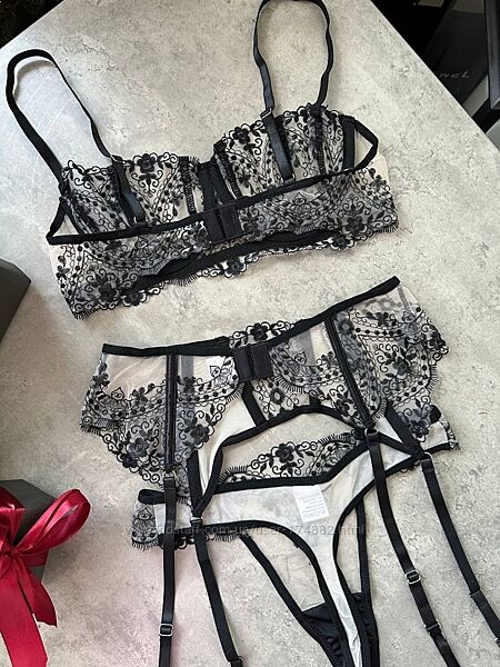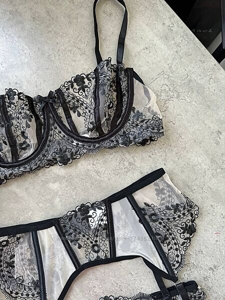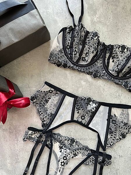 Вишуканий комплект для особового випадку. Білизна поєднує в собі ніжну сіточку та якісну вишивку, шлейки з регуляторами, чашечка зкісточкою. Трусики завищеної посадки, пояс в комплекті.