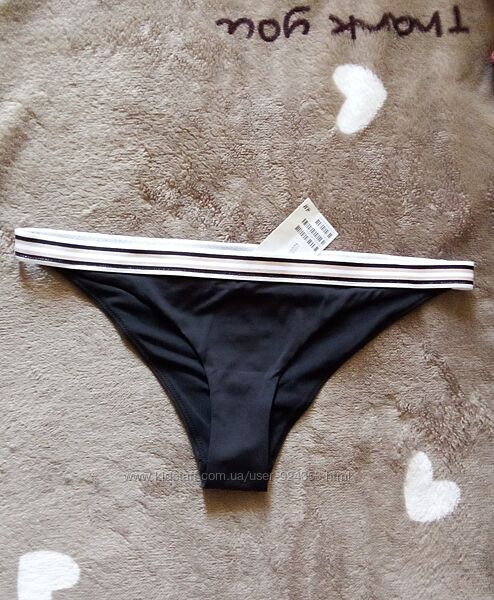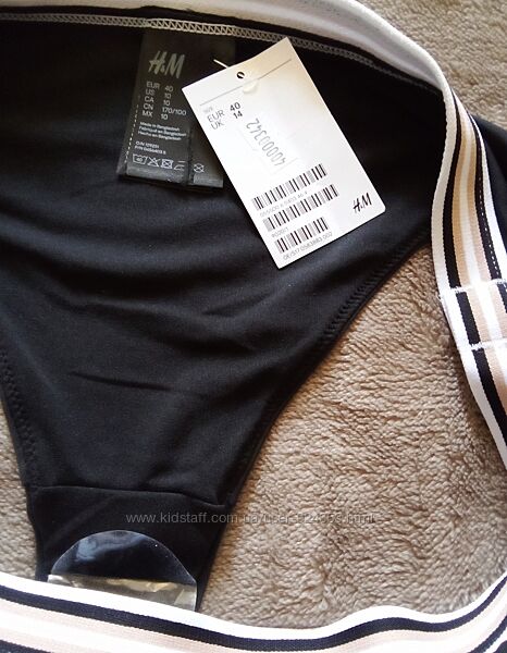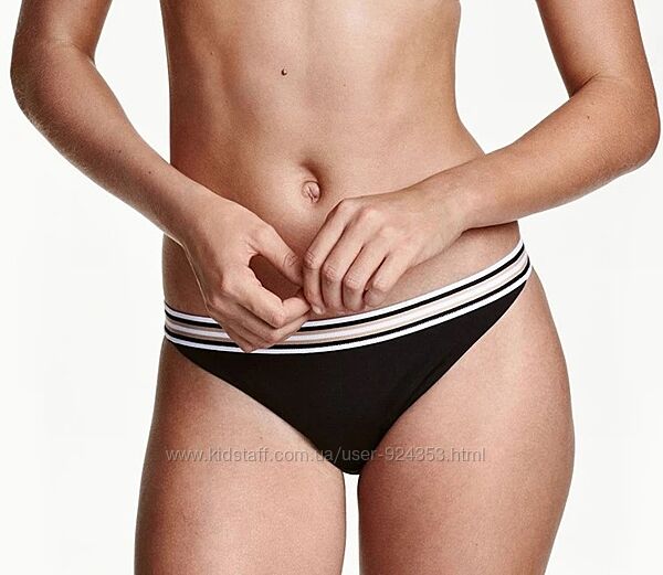 Фото 2-4. Черные трикотажные купальные трусики бикини бренда H&M с бело-бежевой резинкой вверху. Страна производства Бангладеш, размер производителя 40 европейский (подойдет на наш размер 46-48), смотрите замеры. Материал верха – трикотаж 87% полиамид, 13% эластан, подкладка 100% полиэстер, средней плотности, прекрасно держит форму, тянется в меру, не просвечивает.