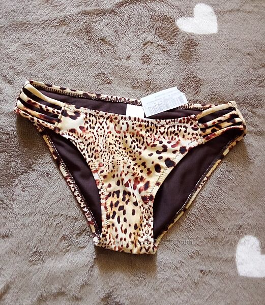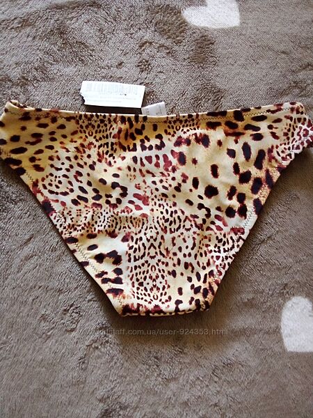 Фото 5-7. Разноцветные трикотажные купальные трусики бикини в леопардовый принт в желто-коричневатых тонах. Страна производства Китай, размер производителя 38 европейский, но маломерит, подойдет на размер XS-S, смотрите замеры. Материал верха – гладкий трикотаж, 82% полиамид, 18% эластан, полностью на подкладке,