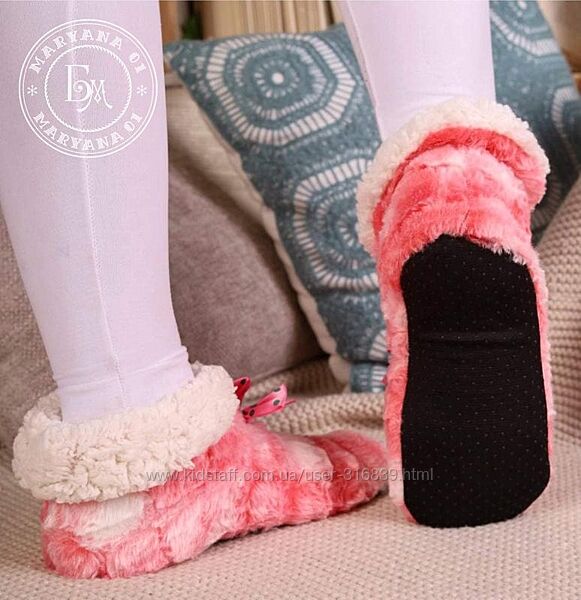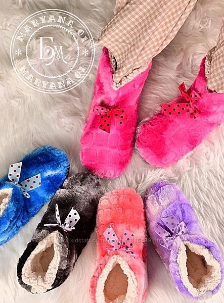 Тапки зручні, в них легко, ноги не потіють. У звичайних тонких шкарпетках та цих тапках ноги не замерзнуть навіть у холодній квартирі. Тапки легенькі та дуже теплі. Верхня частина з яскравого штучного хутра, в середині плотна підкладка з овчини. Підошва пупирчаста, не ковзають. Не потребують додаткового догляду, можливе прання в пральній машині. Дуже універсальна та практична річ, чудовий подарунок. В наявності тапочки універсального розміру різних кольорів.