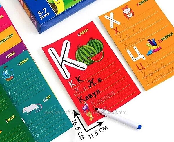 Вибираємо картку, уважно вивчаємо букву та обводимо її контури! Після цього пишемо букву самостійно. Якщо дитина зробила помилку, маркер можна легко стерти і написати заново.