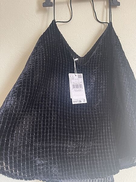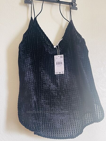 Черный велюровый топ Mango девушке европейского размера S. Красивый фактурный верх, а под низом - шифоновый слой (см.фото). Отличный оригинальный вариант для теплой поры. Длинна от верха шлевки-61, Длинна без шлевки-47 Ширина подмышками-47. Пересылаю после мин предоплаты, остаток - наложенный платеж.