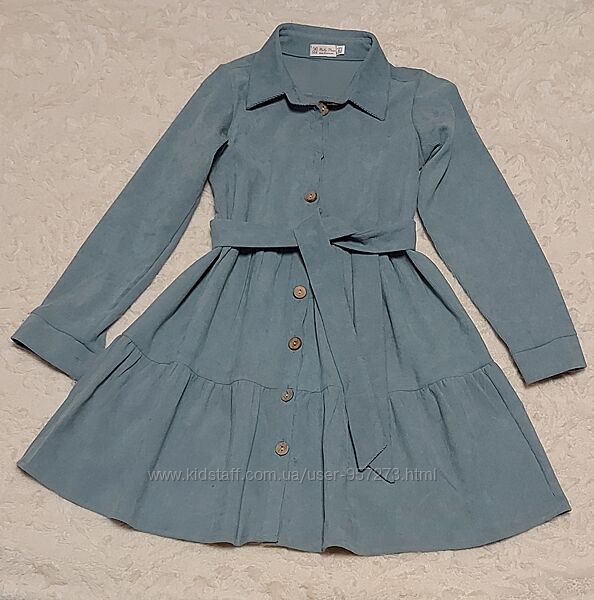 Гудзики по всій довжині виробу. Горловина оформлена коміром. Плаття пошите з вельвету у великий рубчик. Чудово підійде на осінь/зиму для дівчаток.
