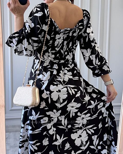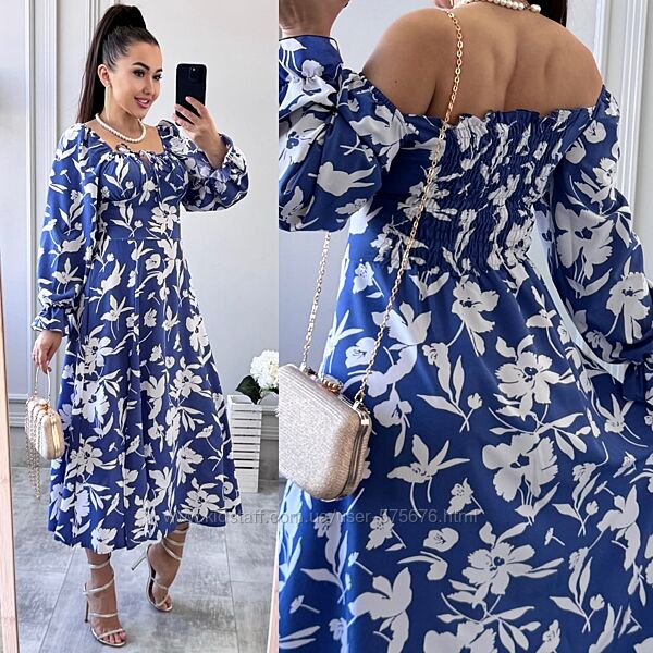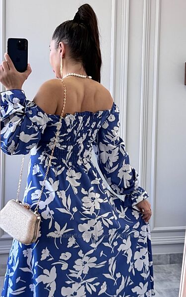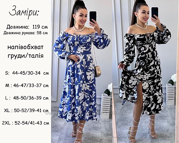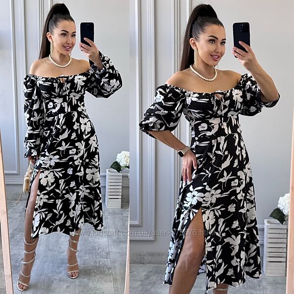 Опис: Ніжна і легка сукня з розрізом на нозі. Довжина моделі міді з відкритими плечима і рукавами-ліхтариками.