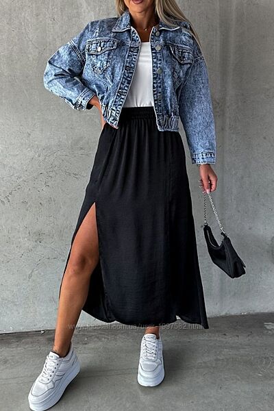 Стильна спідниця вільного крою з розрізами. Талія на гумці. Обов´язкова річ весняно-літнього гардеробу. Спереду спідниця коротше. Виповнена з легкої тканини, приємної до тіла
