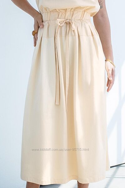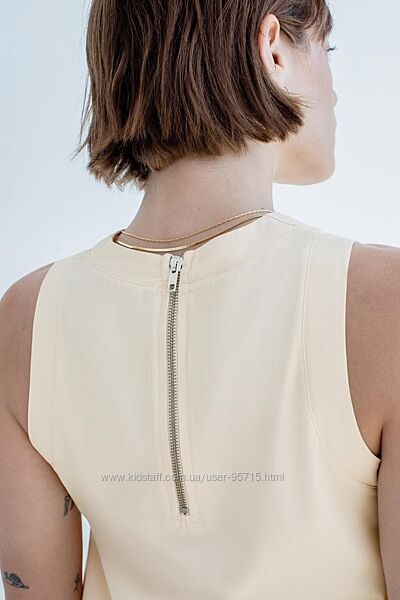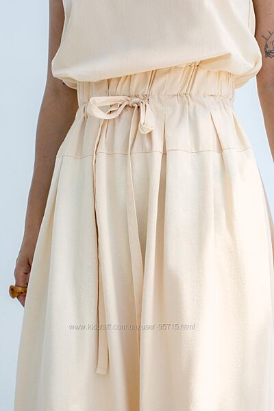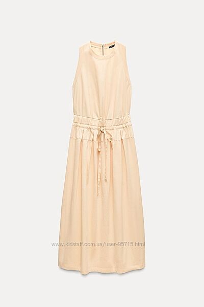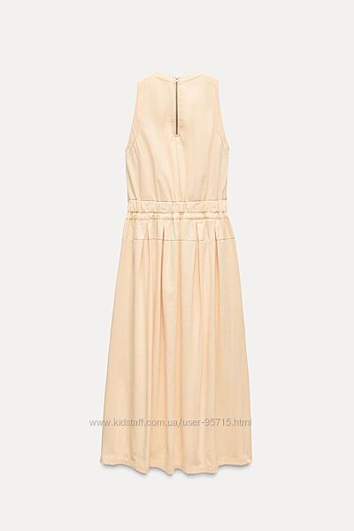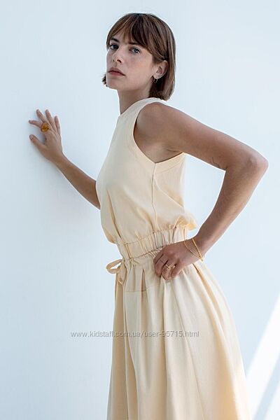 Довга сукня без рукавів зі штапельної бавовни. Круглий комір. Резинка на поясі з регульованими шнурками. Відповідна тканина та складки. Прихована блискавка ззаду.