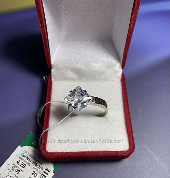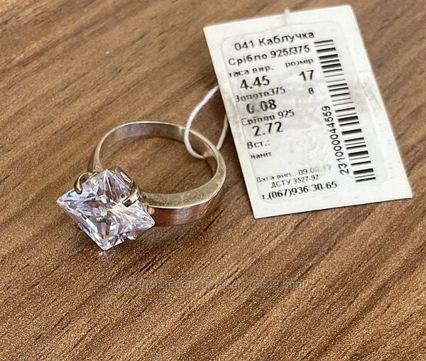 Фото 1-4. Срібна каблучка з білим квадратним цирконом і золотою накладкою.Срібло 925 проби, золото 375 проби, бірка, пломба.