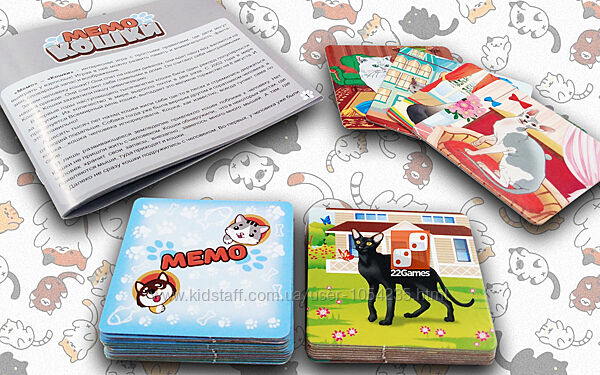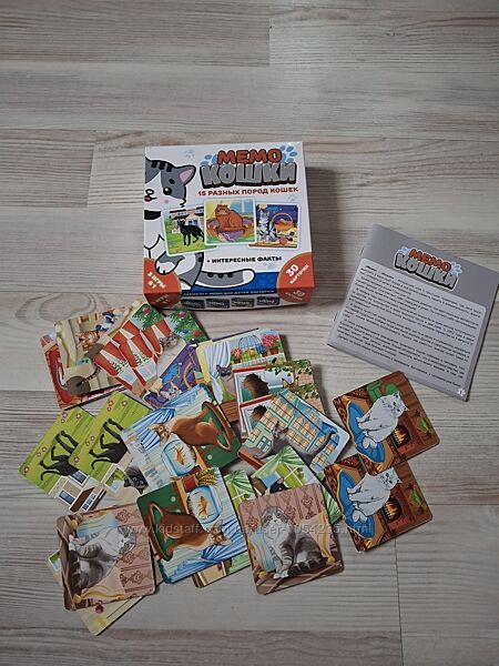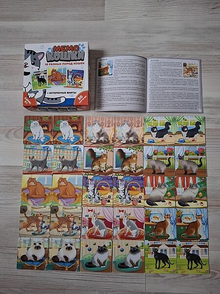 2. Мемо "Кошки". Игра на развитие памяти и внимания. Это классическая игра мемори с парными карточками. На карточках изображены кошки разных пород. Также в комплект входит брошура с описанием всех пород кошек, представленных на карточках, и интересными фактами о них. Карточки выполнены из плотного картона. их трудно помять или порвать. Комплектация: 15 пар (30 карточек) с изображением кошек, брошюра с интересной информацией о кошках. Размер карточек 7,5х7,5 см. Возрастная категория 3+. Цена: 200 грн.