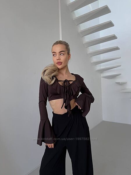 Подробное описание: Жіночий топ з довгим рукавом трикотажний з воланами білий чорний коричневий
