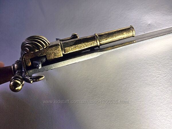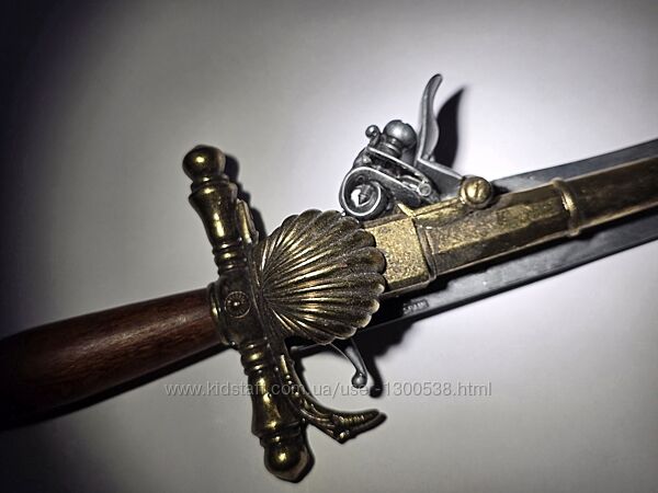 Копія кремневого пістолета з кинджалом, виготовлена з дерева та металу, з імітацією ударно-спускового механізму. Кремневі пістолети часто використовували піратами XVIII століття. В основі механізму цього пістолета лежить кремінь, який під час зведення затвора висікав іскри та запалив порох. Перезаряджати його потрібно було вручну після кожного пострілу. Боєприпаси складаються з пороху, кулі та паперового пажу та заряджалися через дуло. Завдяки паперовому пижу інші компоненти щільно знаходилися в пістолеті та не висипалися.В бою цю зброю зазвичай використовували, щоб зробити один єдиний постріл: перезаряджати його було справою довгим, а часу було мало. Тому солдати могли брати із собою мечі або шаблі або використовувати пістолет як дубинку. Відчуйте дух піратських пригод у Карибському морі з історичною копією цього пістолета від Denix!Розмір - 38 см, вес - 500 г. Пистолет-кинжал, Франция XVIII в. испанского производства. Сувенирное оружие с металлической частью из цинкового сплаваХарактеристики