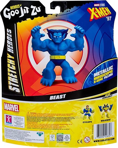 Marvel Studios X-Men ´97 і Heroes of Goo Jit Zu знову об´єднали зусилля, щоб запропонувати вам найкращу лінійку найрозтяжніших, найлипучіших і найхлюпатіших фігурок MARVEL X-Men! Beast об´єднав зусилля з Heroes of Goo Jit Zu, щоб стати супертягучим лиходієм! Ця фігурка Goo Jit Zu Marvel X-Men ´97 може розтягуватися, крутитися та хлюпати своєю унікальною металевою реоскопічною начинкою X-Gene і рухатися так, як ніколи раніше! Завдяки його надзвичайно липкій начинці ви можете стиснути його тіло та спостерігати, як його металева начинка кружляє! Стискайте, хлюпайте та розтягуйте його руки, ноги та тіло! Його дивовижне липке тіло може розтягнутися в 3 рази, а потім повернутися до початкової форми та розміру! Зберіть усі 4,5-дюймові набори героїв MARVEL X-Men, включаючи Росомаху та Циклопа. Відкрийте для себе новий спосіб гри та врятуйте день із цими крутими колекційними персонажами MARVEL X-Men ´97 Heroes of Goo Jit Zu! Найлипучіші, найрозтяжніші герої в історії! Фігурки героїв Goo Jit Zu не схожі на інших! З їх еластичними, м’якими тілами, руками та ногами, ці дивовижні сенсорні іграшки надають дітям новий ГРУЗИЙ спосіб грати без безладу!