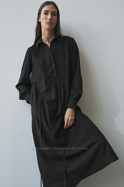 Сукня міді з коміром та довгими рукавами. Манжети, пояс, що зав´язується. Складання на грудях. Застібається на гудзики. Сумішова тканина, 30% віскози.