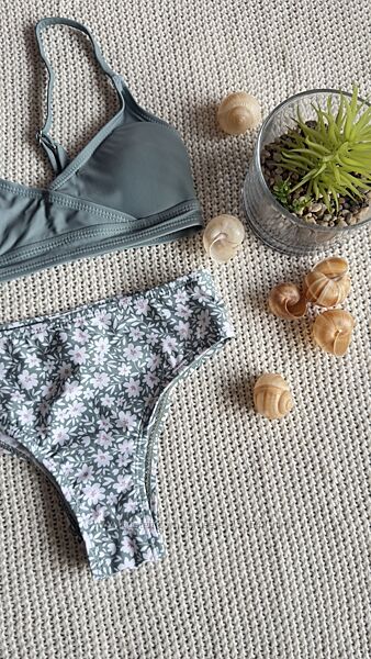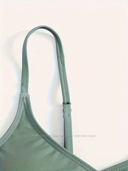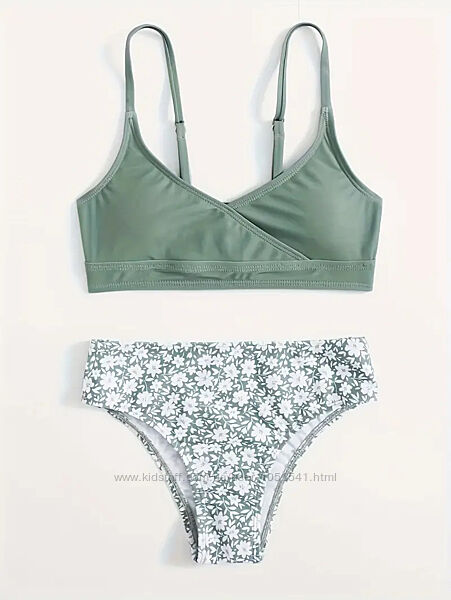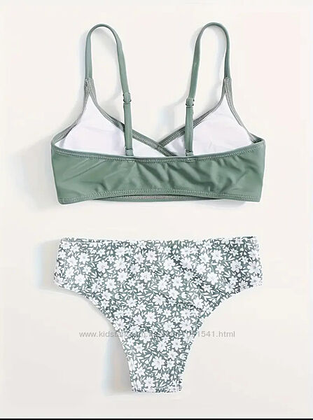 Роздільні купальники зеленого кольору з принтом білих квіточокВерх топ - з підкладкою попереду , на тонких бретельках, низ - плавки бікіні .