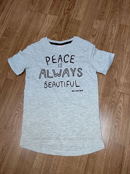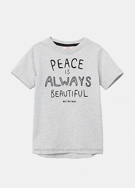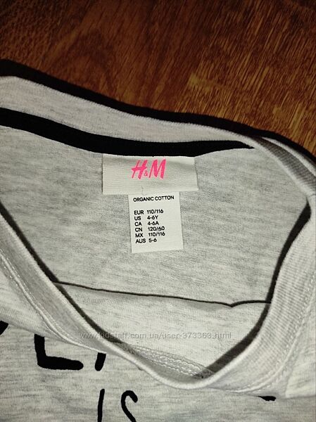 Футболка унісекс H&M. Склад: 98% бавовна, 2% віскоза. Колір: світло -сірий. Розмір: 110/116 на 4-6 років. Довжина - 50/52 см (ззаду довше) Довжина рукава від плеча - 14 см ПІГ - 35 см Плечі - 30 см.