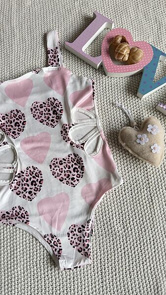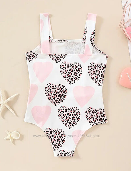 Дитячий цільний, закритий купальник ,білого кольору в рожевий леопардовий принт сердечка ,Купальник має широкі шлейки і вирізи на талії .Китай