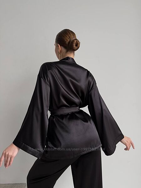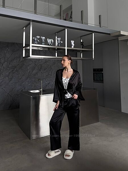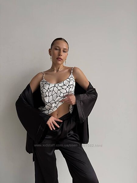 Сатинова піжама включає в себе три елементи: вільні широкі штани з кишенями та еластичною талією, класичну сорочку з довгими рукавами з прикрашену поясом, а також легку майку на тонких бретелях.