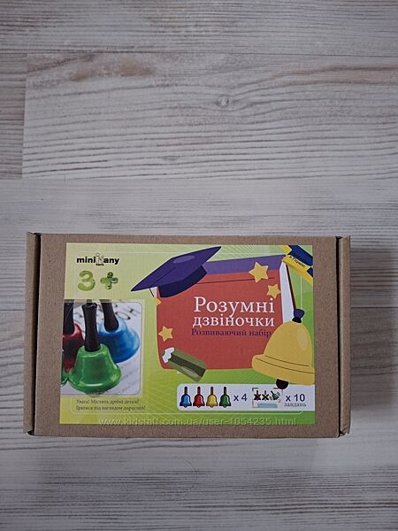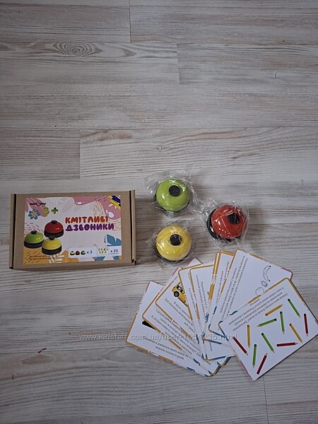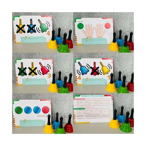 2. Развивающий набор "Умные звоночки". Развивающий набор станет любимой игрой вашего ребенка. В нем малыш найдет 4 разноцветных звоночка. Они помогут ему запомнить цвета, цифры, научиться считать и решать много полезных заданий с карточек. Попросите ребенка расставить все звоночки в один ряд и рассказать, какого они цвета. Возьмите карточку, прочитайте задание вслух. Пусть малыш выполнит его. Если будут трудности, помогите ребенку быстрее прийти к правильному ответу. Фантазируйте и придумывайте для ребенка свои задания на внимание и сообразительность. Игра развивает логику, восприятие цвета, фантазию и учит счету. Комплектация: 4 звоночка разных цветов и 10 карточек с заданиями. Возрастная категория 3+. Цена: 450 грн.
