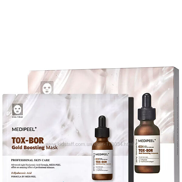 Питательная маска для повышения упругости кожи Medi Peel Tox-bor Gold Boosting Mask, ваш секрет к упругой и сияющей коже. Эта питательная маска, обогащенная чистым 24-каратным золотом (99,9%), предназначена для мгновенного восстановления эластичности, глубокого увлажнения и устранения признаков усталости.Сочетая инновационные ингредиенты, такие как экстракт корня чабреца, коллаген и 8 слоев гиалуроновой кислоты, она обеспечивает интенсивный уход, даря коже роскошное превращение уже после первого применения.