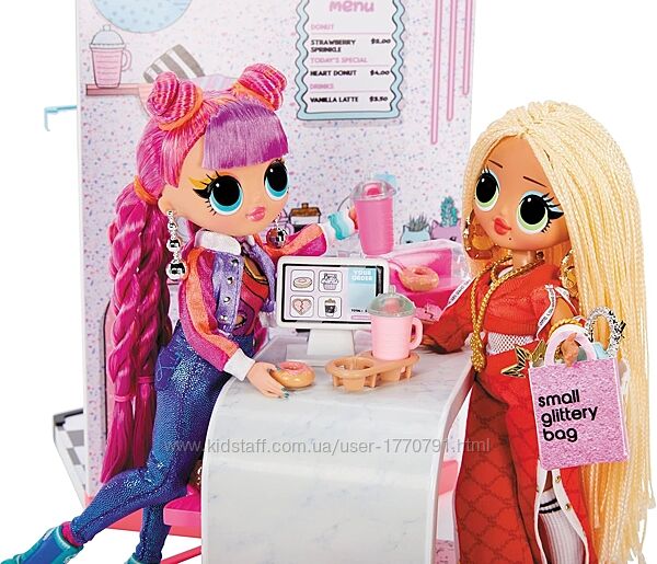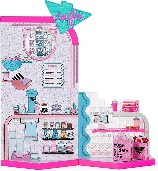 Кафе з вітриною, стійкою та касою;Взуттєвий магазин із взуттям для великих ляльок лол та маленьких сестричок;