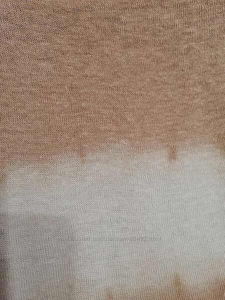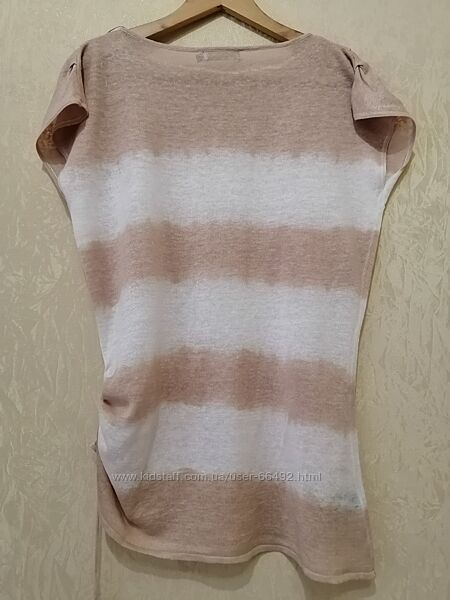 М´якенький трикотаж. Широкі смужки молочного та світлого капучіно. Льон 100%. На спеку - супер одяг! Драпірування з однієї бічної сторони регулюється. На плечах призібрана.