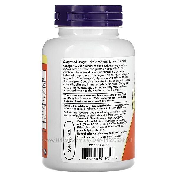 Омега 3-6-9 являє собою суміш олій насіння льону, першоцвіту вечірнього, каноли, чорної смородини та гарбузового насіння. Now поєднує в собі ці відомі поживні олії для створення збалансованих пропорцій жирних кислот омега-3, омега-6 і омега-9. Омега-3, альфа-ліноленова кислота (АЛК) й омега-6, ГЛК, відіграють важливу роль у підтриманні здоровя шкіри та функції імунної системи. Харчова олеїнова кислота, мононенасичена жирна кислота омега-9, повязана зі здоровям серцево-судинної системи.