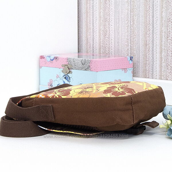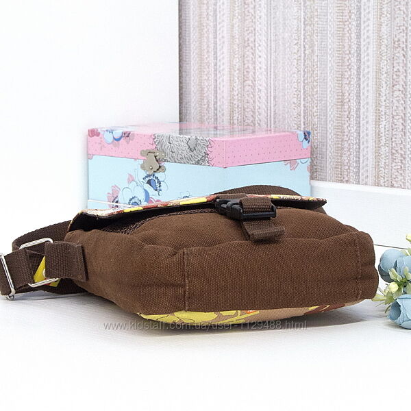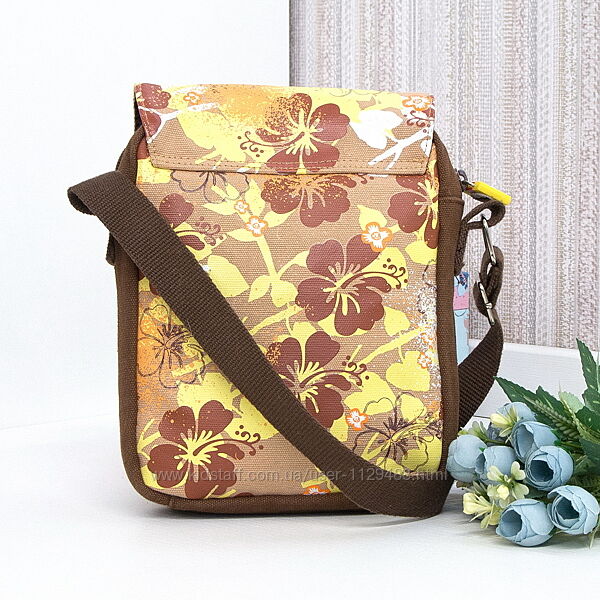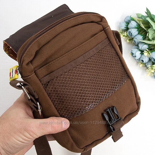 Компактная, достаточно вместительная, закрывается клапаном на защелку, под ним сетчатый карман и большой плоский карман, далее основное объемное отделение на молнии, в нем карман на молнии, открытый кармашек и карабин для крепления связки ключей. Сумка выполнена из плотной прочной хлопковой ткани, на подкладке, форму держит.