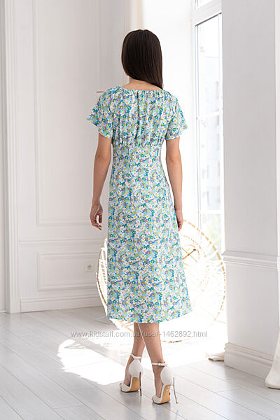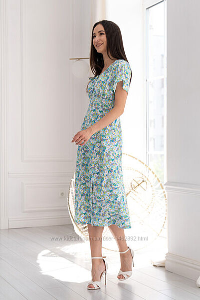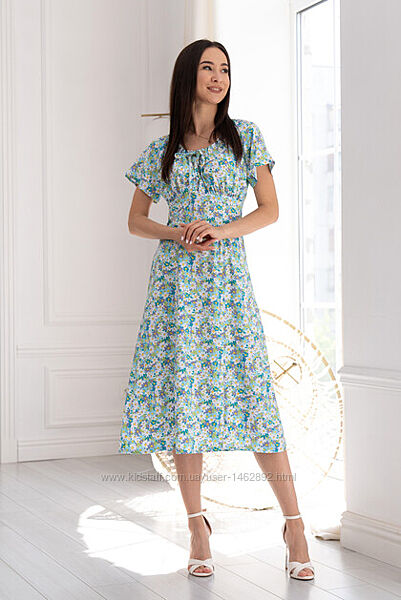 Сукня полуприлеглого силуету довжиною міді, виконане з прохолодного штапелю. Ліф сукні відрізний, має призборювання під грудьми та по спинці. Короткий вільний рукав-реглан. Горловина сукні призбарюється на тонкий шнур, виконаний зі штапелю, підкреслює декольте.Приталеність сукні досягається завдяки талієвим витачкам. По переду оброблений розріз у вертикальному шві, над лівим коліном. Для зручності в лівомоу боковому шві втачана потайна «блискавка».