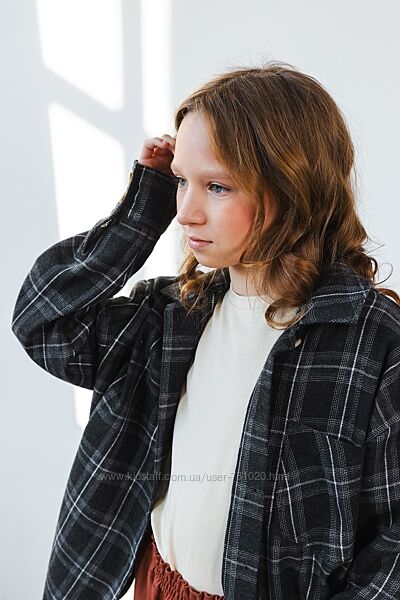 Легка сорочка для дівчат зростом 134–168 см, ідеальна для сезону весна-літо. Має вільний крій із трохи спущеною лінією плеча, що забезпечує комфорт і стильний вигляд.Виготовлена з нещільної, дихаючої тканини, приємної на дотик, що підходить для теплої погоди. Картатий принт у темних відтінках із білими лініями робить сорочку універсальною для поєднання з різним одягом.