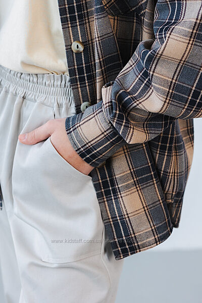 Легка сорочка для дівчат зростом 134–168 см, ідеальна для сезону весна-літо. Має вільний крій із трохи спущеною лінією плеча, що забезпечує комфорт і стильний вигляд.Виготовлена з нещільної, дихаючої тканини, приємної на дотик, що підходить для теплої погоди. Картатий принт у відтінках бежевого та темно-синього робить сорочку універсальною для поєднання з різним одягом.