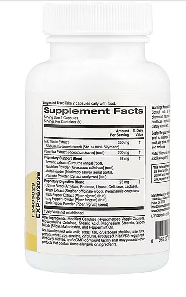 Добавка для поддержки детоксикации* от Super Nutrition® содержит растительные компоненты, такие как семена расторопши и экстракт корня кутки, в сочетании с запатентованной поддерживающей смесью из экстракта куркумы и порошка одуванчика, а также запатентованной смесью, способствующей пищеварению, для поддержания здоровья печени*.