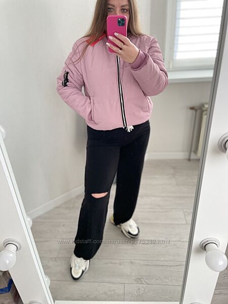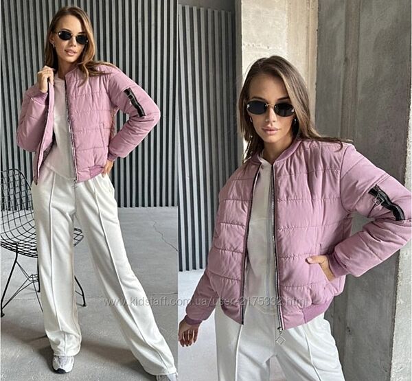 Демісезонний рожевий бомбер на блискавці, виконаний із стьобаної плащової тканини на тонкому синтепоні. Модель прямого крою з бічними кишенями та довгими рукавами. Куртка оснащена коміром-стійкою та манжетами з фактурного трикотажу. На рукаві накладна кишеня на блискавці.