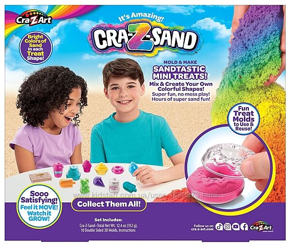 Cra-Z-Sand Sweet Treats Mini Mania постачається з 10 формочками для солодощів, наповненими яскравим Cra-Z-Sand, які приємно використовувати та використовувати повторно. Cra-Z-Sand легко очистити, тому що він прилипає лише до себе!