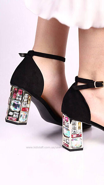 Добавьте элегантности и стиля в свой образ с нашими женскими черными замшевыми босоножками на каблуке. Эти модные босоножки идеально сочетают в себе комфорт и изысканность, делая их незаменимым элементом вашего гардероба. Стильные женские босоножки из искусственной замши – идеальный выбор для любого образа. Черный цвет придает элегантность, а устойчивый каблук высотой 8 см, украшенный цветными камнями, добавляет изысканности. Модель с закрытой пяткой надежно фиксируется на ноге благодаря тонкому ремешку с пряжкой. Отличный вариант для особых случаев, вечеринок или повседневной носки.