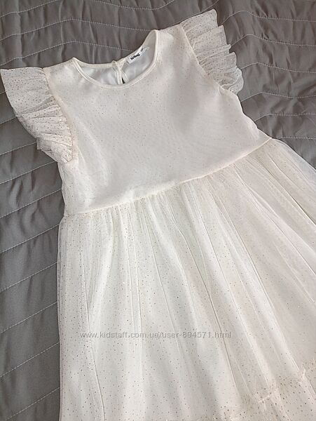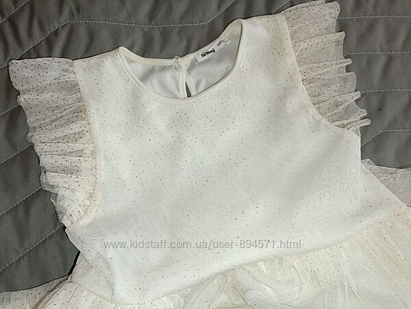 Праздничное платье с золотыми блестками. Размер 134. На груди есть места где блестки осыпались. В остальном платье в идеальном состоянии. Длина 70 см, полуобхват груди 32 см, плечи 23 см, полуобхват талии 34 см.