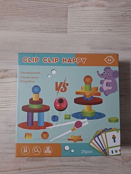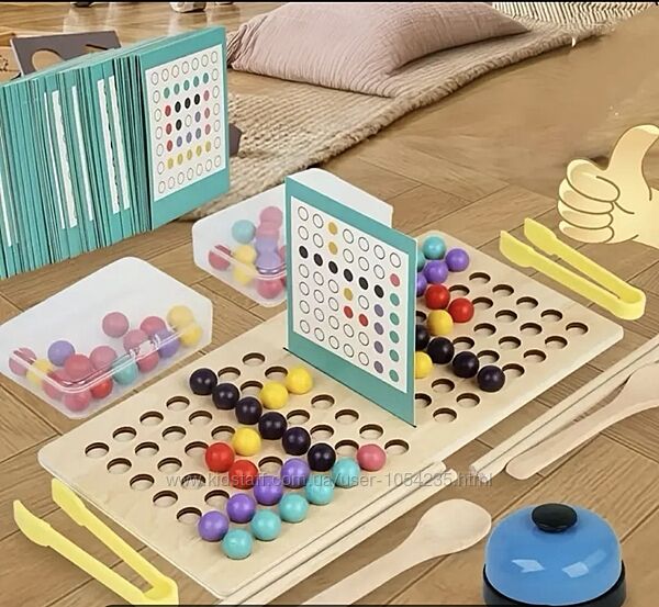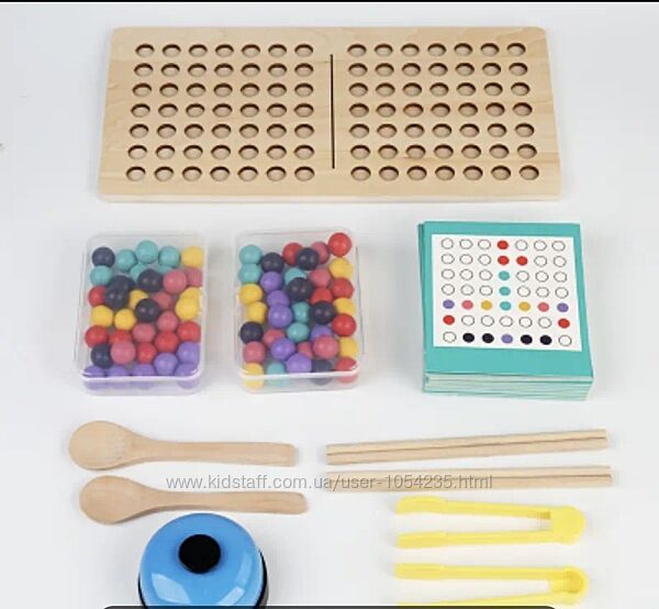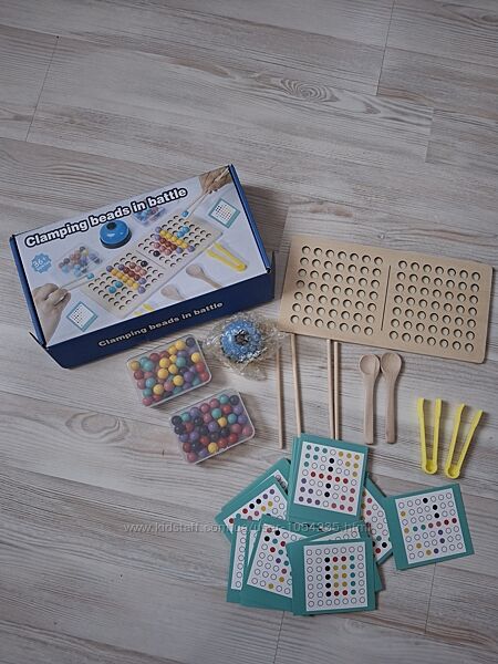 2. Деревянная игра "Шарики на двоих". В наборе 2 коробочки с цветными шариками (размер одной коробочки 10,5х7,5 см.); деревянное игровое поле для двоих с отверстиями (размер 33х17 см.); карточки с заданиями (48 двусторонних карточек размером 11х9,5 см.); пинцет 2 штуки размером 10,5х2,5 см.; ложка деревянная 2 штуки размером 12,8х2,8 см.; палочки деревянные 4 штуки размером 16 см.; звоночек 7,3х4,8 см. Два игрока соревнуются в размещении цветных шариков на игровом поле в соответствии с карточкой-заданием. Для этого используется один из инструментов: пинцеты, ложки или палочки. Игра тренирует концентрацию и ловкость, точность и внимание, мелкую моторику, распознавание цветов. Возрастная категория 3+. Цена: 650 грн.