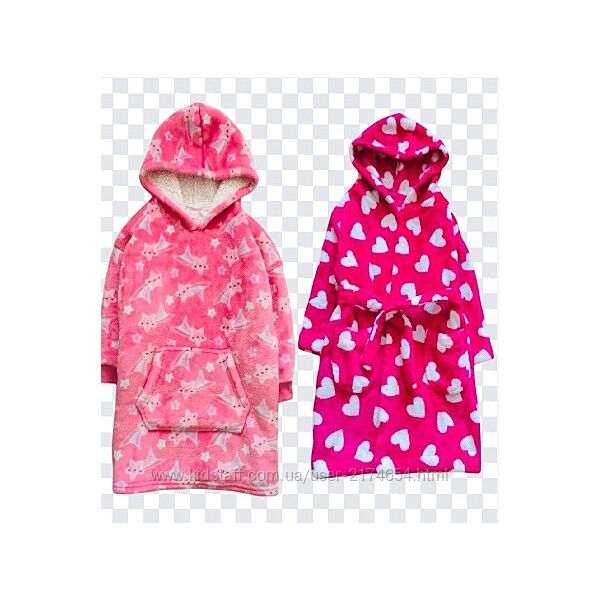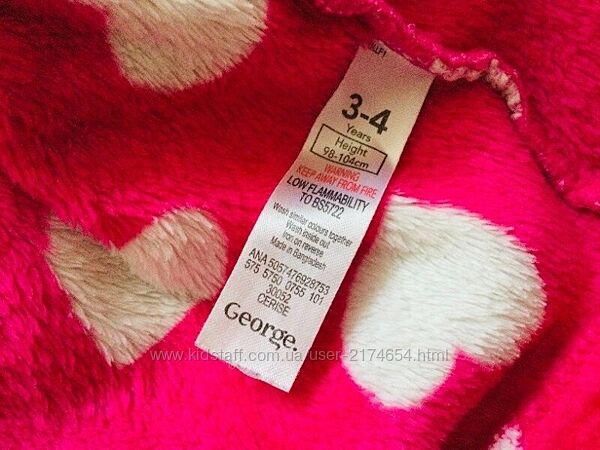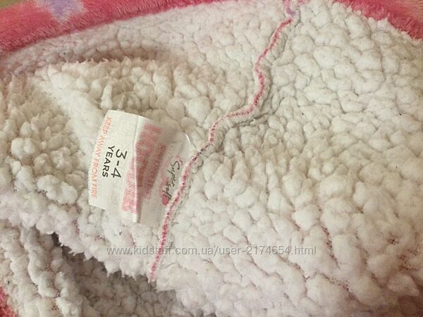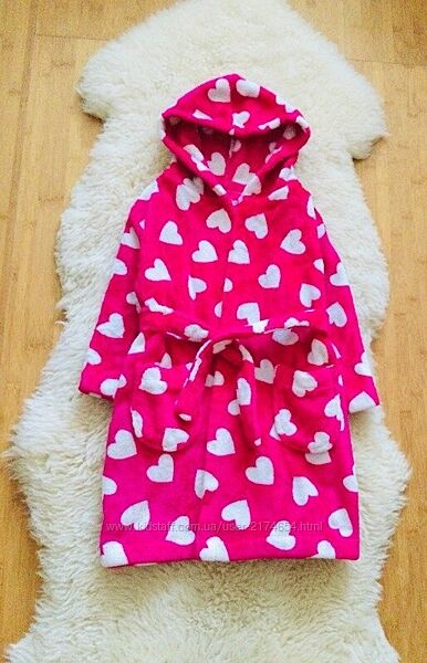 3-4 рок, 98-104 зріст. George флісовий, махровий, пухнастий халат ягідного кольору з білими сердечками і зірками. теплий, банний, на море або в басейн. Стан: нового, слідів носки нема, завязується на талії пояском. є Кишені.з білими сердечками довжина 60; рукав від вороту 42