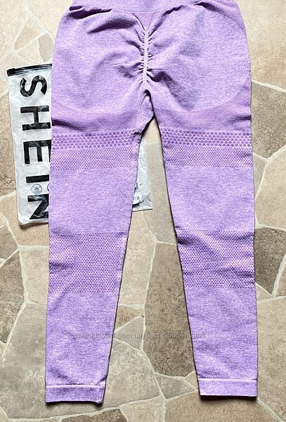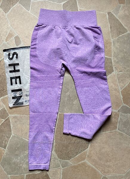 Відмінна якість! Зональні спортивні легінси з ефектом пуш-ап. Комфортна, стильна, еластична модель для спорту. Тканина щільна, приємна до тіла, м´яка, не просвічує. Склад: 54 % поліамід, 36% поліестер, 10% еластан. Широкий пояс, висока посадка. Безшовні. Вказано розмір М, дивіться виміри в спокійному стані: напівОТ 32, напівОБ 40, посадка близько 31, довжина 84, ширина пояса 8, ширина штанини зверху 18, внизу 10 см. Колір красивий бузковий. Дефектів немає. Увага! Усі речі Shein приходять без паперових бірок. Є лише пакувальні пакети із логотипом. Це абсолютно нові реч