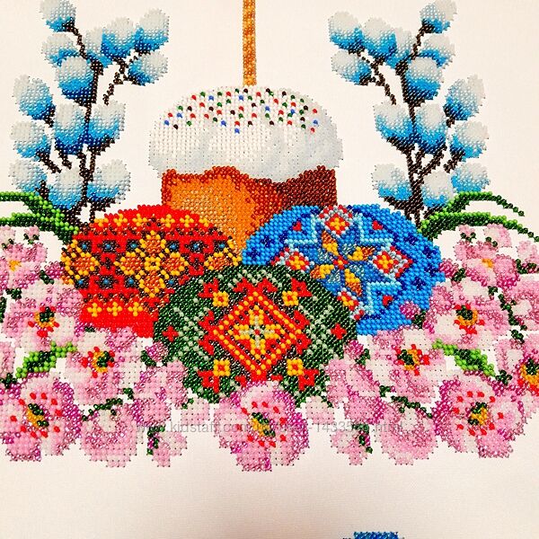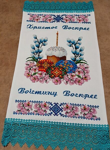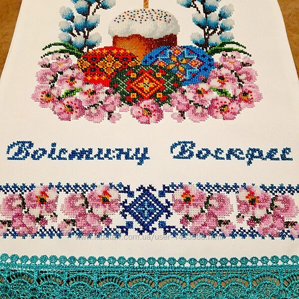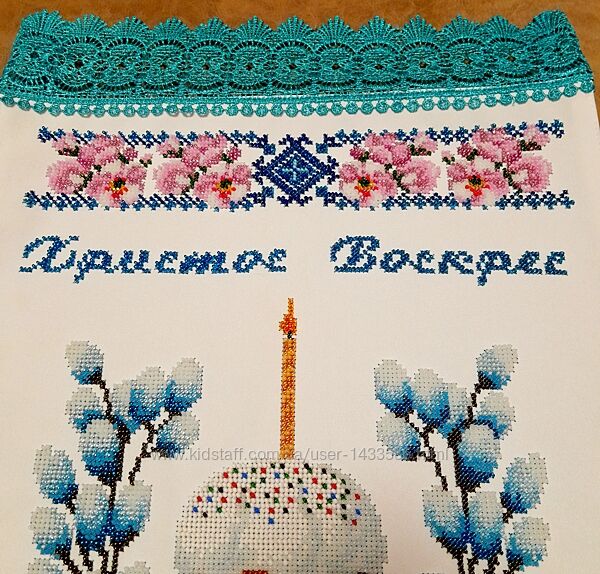 Рушничок пасхальний вишитий бісером, підшитий тканиною, оздоблений мережкою.Розмір рушничка 65 х 33см