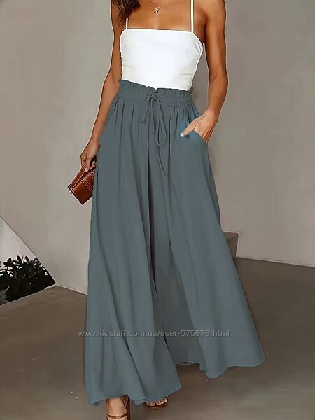 Літні вільні брюки-спідниця із кишенями. Модель прямого крою з високою посадкою та широкою поясною гумкою з рюшами.
