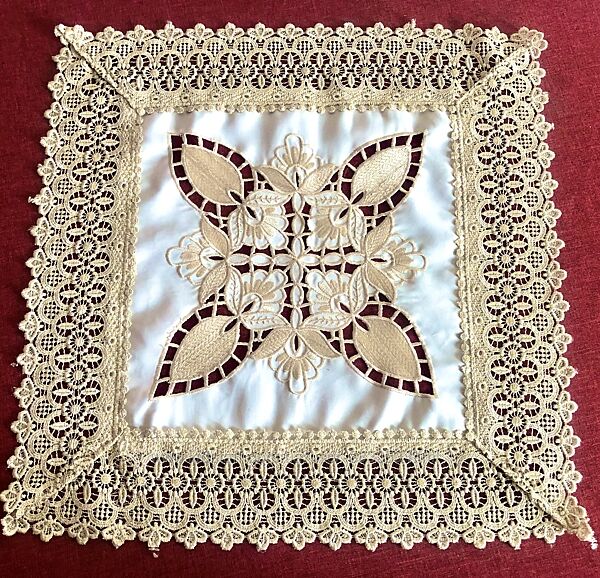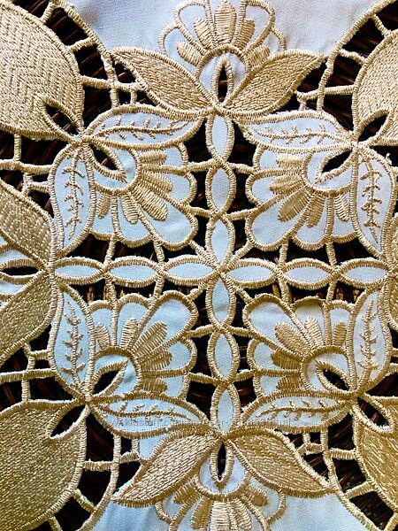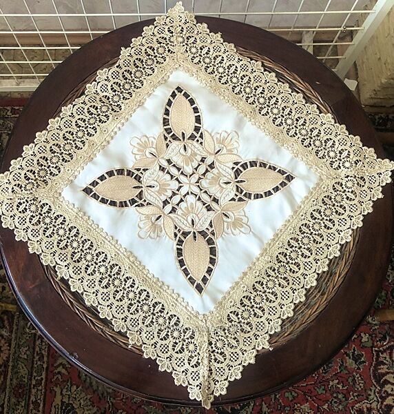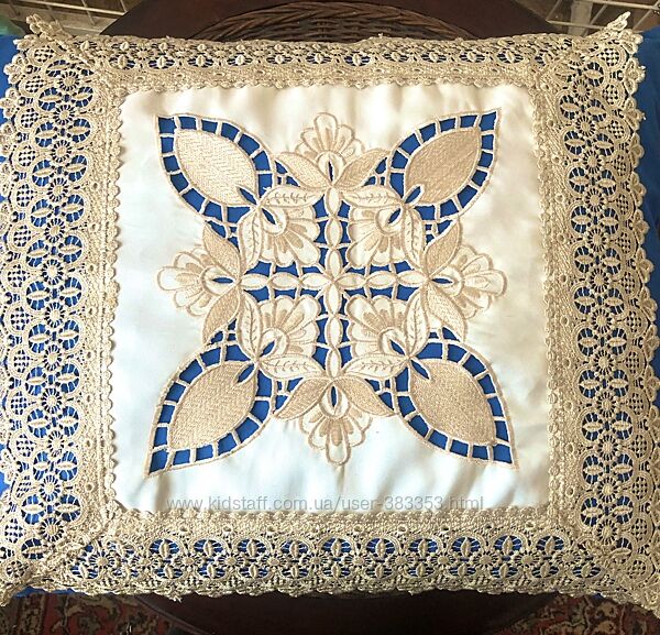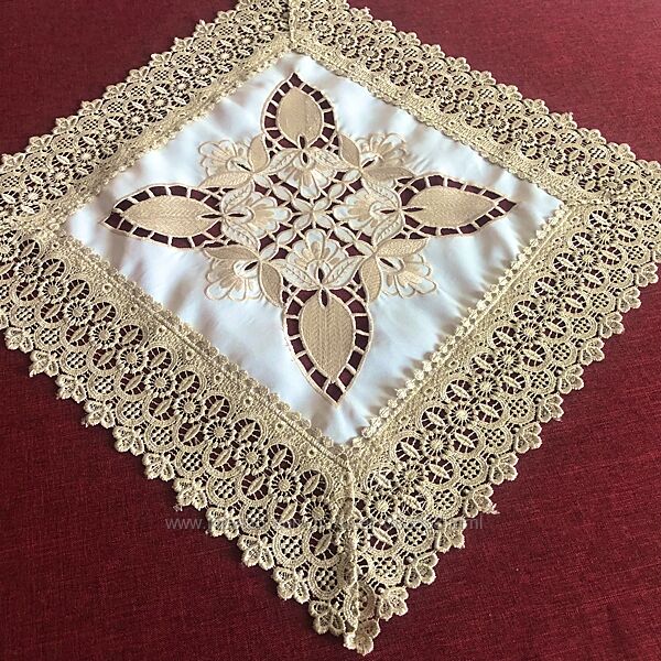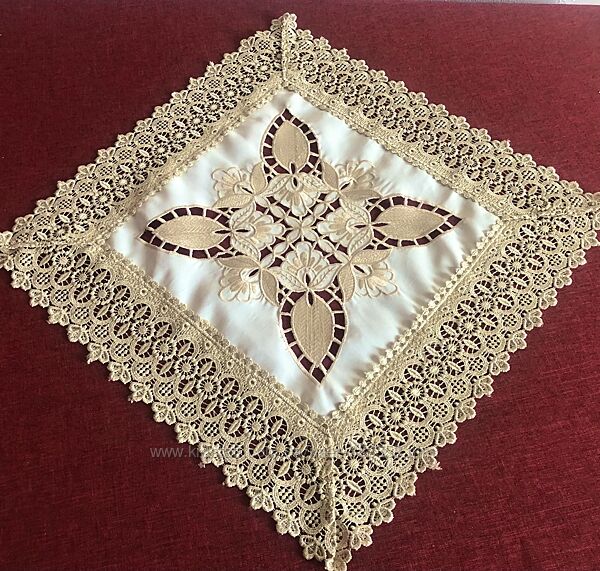 Салфетка с широким золотым плауэнским кружевом и вышивкой ришелье шелковой золотой нитью Для декора столешницы Размер 45х45 см Для ценителей ручной работыДругие объявления продавца
