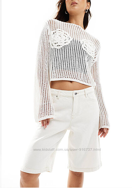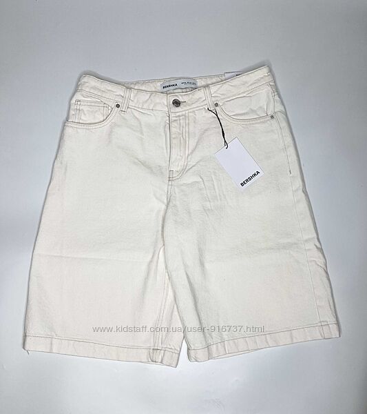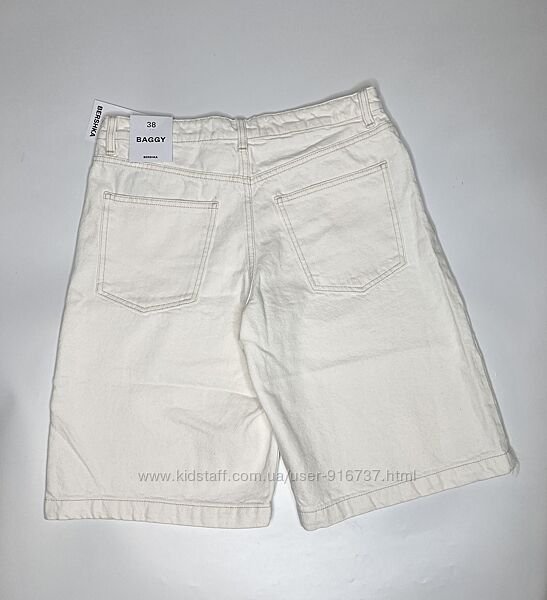 Джинсові шорти бермуди Bershka. Розмір 38, висока посадка. Талія 42 см, стегна 60 см, довжина 56 см. крок 28 см, посадка 31/35 см, ширина штанини внизу 31 см. Склад: 100% котон.