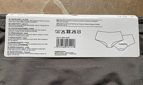 Відмінна німецька якість! Якісний, комфортний матеріал. Склад: 88% поліестер, 12% еластан. Супер м´які з легким глянцем Трусики з повномірною задньою частиною. Комплект із двох штук. Вказано розмір М (40-42) європейський, дивіться виміри: напівОТ 34, посадка 22, ширина збоку 8 см. Без недоліків. Колір красивий хакі. В наявності також чорні.