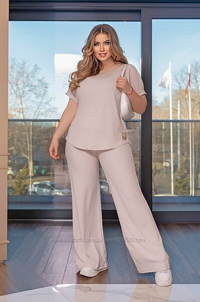 Жіночий прогулянковий костюмКостюм складається з футболки з коротким рукавом та брюк палаццо з високою посадкою. На футболці знизу виконані бічні розрізи, пояс штанів – на резинці.