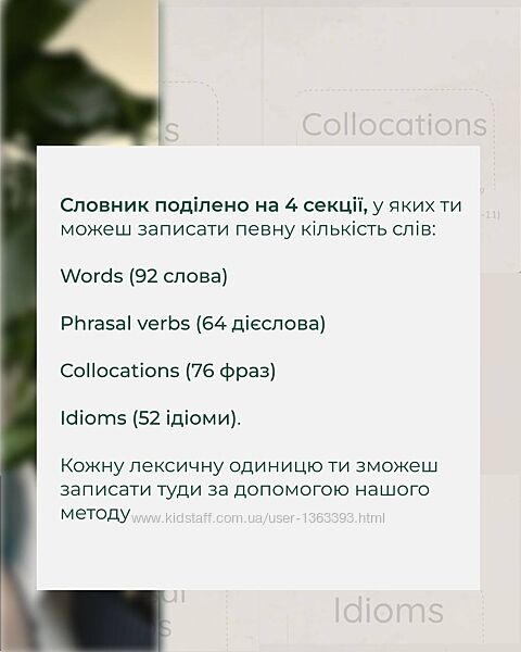 - 4 секції для запису нових слів та словосполучень (Words/ Collocations/ Phrasal verbs/ Idioms) + приклади заповнення кожної секції