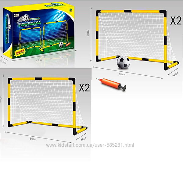 захоплюючий ігровий набір для будь-якого юного футболіста, в комплект входить ворота з сіткою розміром 80-60-46 см - 2 шт., мяч, насос для надування, розмір коробки 42-22,5-11 см. Ворота мають складну конструкцію, це дуже зручно для транспортування та зберігання, такий набір чудово розвиває дитину фізично, тренує спритність та влучність, та й просто дозволяє весело проводити час із друзями та батьками.