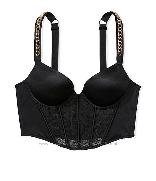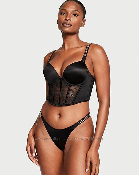 Новий, бірку зрізала. Мені подарили, але не підійшов розмір. Корсет 75А. Опис Цей розкішний комплект білизни складається з подвійного пуш-ап Bombshell Push-Up, який створює неймовірний підйом та наповненість завдяки спеціальному супер-м’якому наповнювачу чашки, що пристосовується до форми твого тіла. Прозорі сітчасті панелі поєднуються з красивим квітковим мереживом у цьому чарівному бюстьє-корсеті, яке ідеально підкреслює фігуру. З новими бретелями, прикрашеними сяючими ланцюжками, якими ти захочеш похизуватися. Класичні стрінги, що входять в набір, м´які, делікатні та трохи зухвалі, прикрашені ланцюжками з боків.
