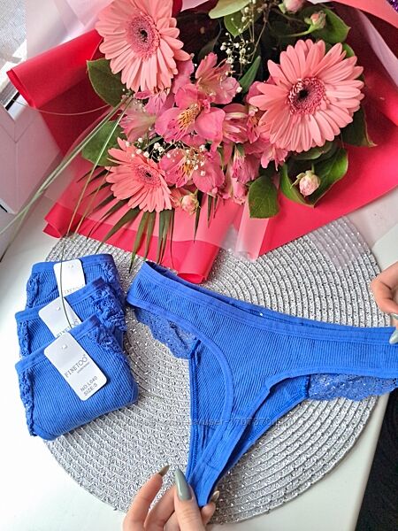Мереживні жіночі трусики стрінгі в рубчик.Витончений дизайн та дуже приємний на дотик матеріал. Склад: 95% бавовна, 5% спандекс.Кольори електрик та слива