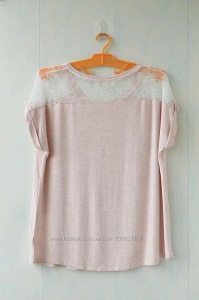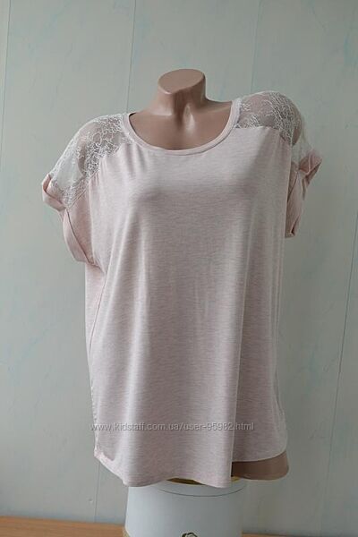 Реальний колір на вішалці.Ніжна блуза з мереживом George, з ніжного, приємного до тіла віскозного трикотажу. На бирці розмір 16-18,