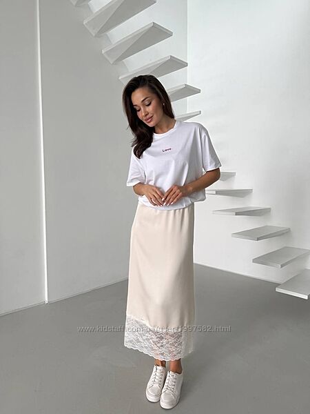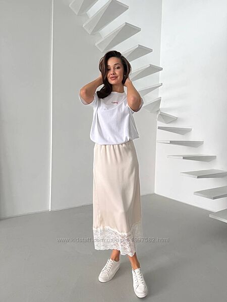 Подробное описание: Спідниця сатинова з мереживом міді літня з високою талією чорний молочний